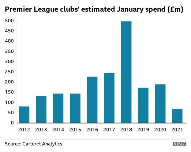 The below graph demonstrates Premier League clubs’ estimated January spends from the year of 2012 up to 2021.